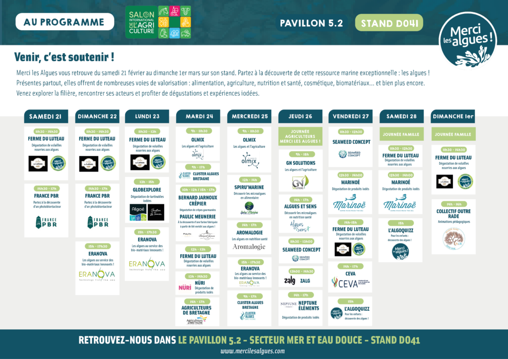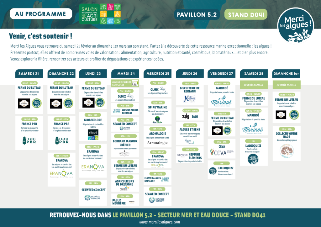 Du 21 février au 1er mars 2026, l’association Merci les Algues participe au Salon International de l’Agriculture pour faire découvrir au grand public et aux professionnels le rôle clé des algues dans l’agriculture, l’alimentation et les innovations durables.